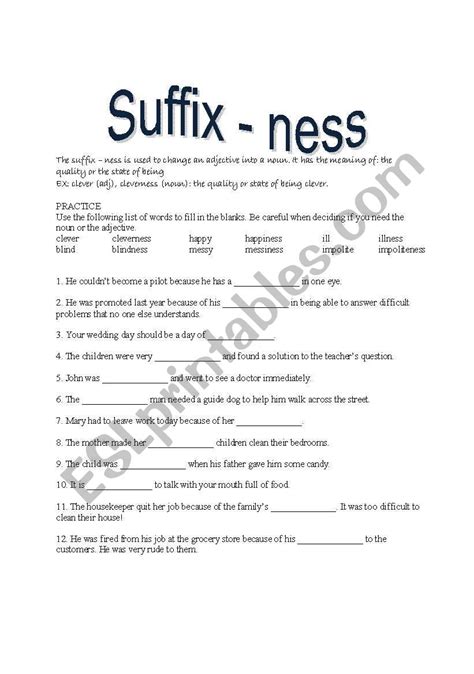 Ness Suffix Worksheet. The students must add the correct the. Add to my workbooks (0) download file pdf embed.