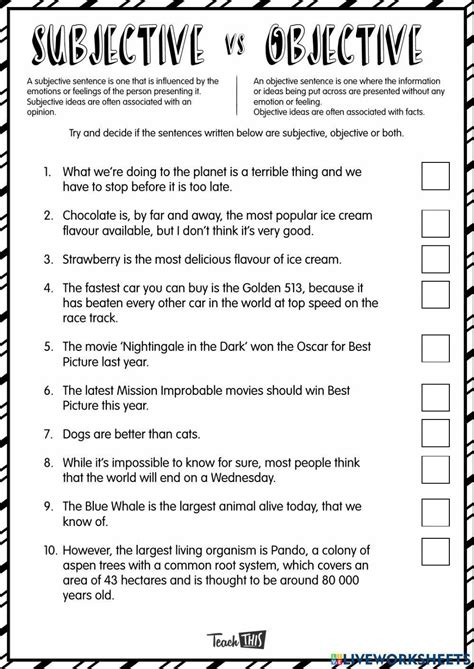 Objective Vs Subjective Worksheet. Web objective and subjective are opposites. Web on this worksheet, identify if the statements are objective enough for a newspaper or if they are considered subjective and why.